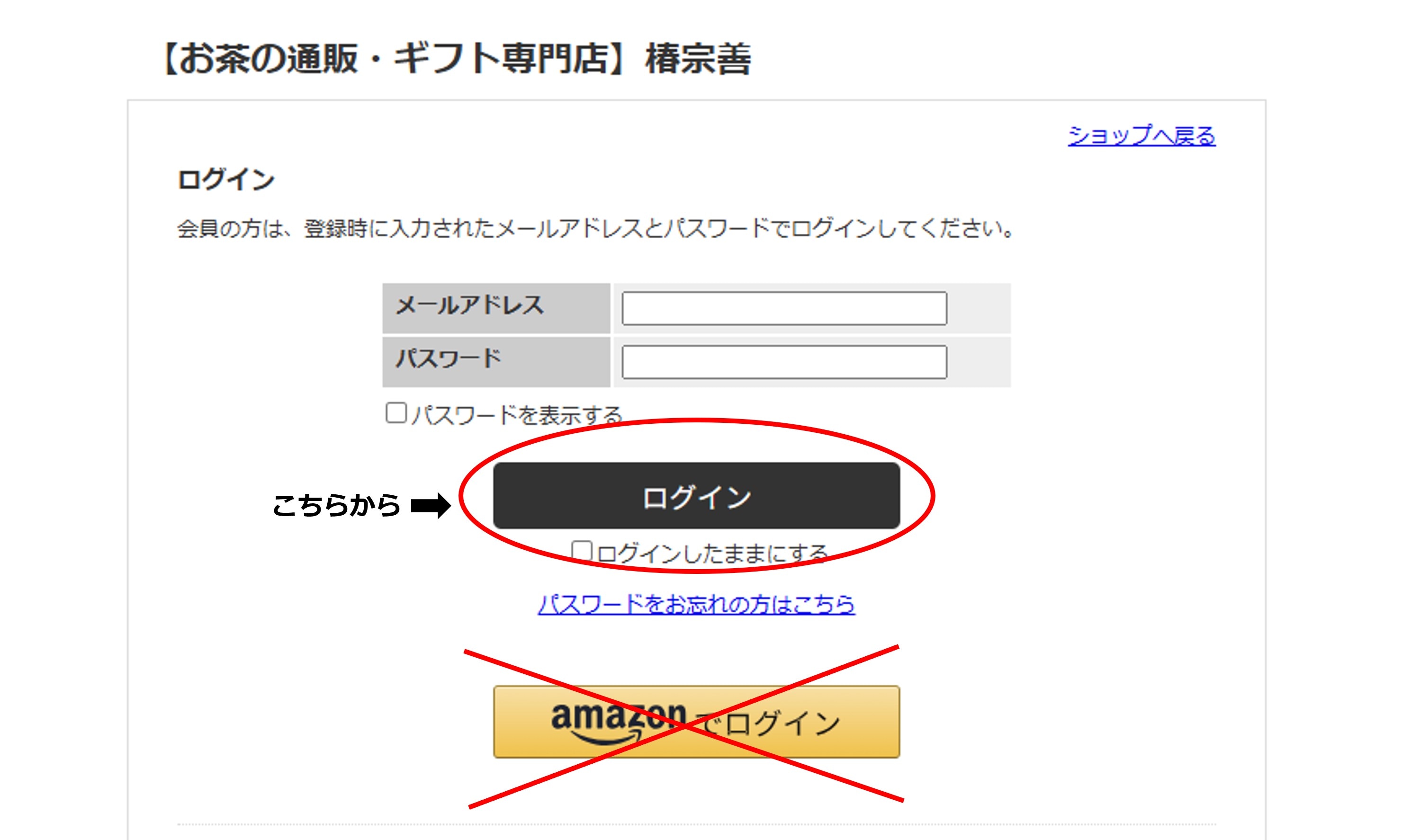- 椿宗善オンラインショップの右下にあるログインボタンをクリックしてください。